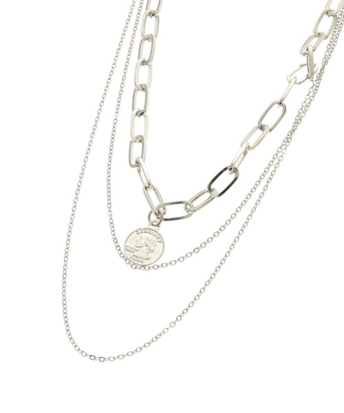 【デザイン】 トップにコインモチーフをあしらった3連仕様のネックレス。 ごろっとした太めのチェーンと華奢なチェーンを組み合わせたバランスがお洒落なアイテムです。 いつものコーディネートに取り入れるだけで、クールな印象に。 店舗へのお問い合わせ商品番号:320-21381 ●製品寸法: 00:全長40cm モチーフH1.2cm W1.2cm 備考: