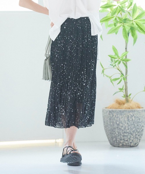 大人気のシャイニープリーツスカートに新柄の星柄が登場!シャイニーな素材感が揺れるたび可愛いプリーツスカート。細かいプリーツがシンプルながらも目を引くコーデの主役になるアイテムです。ウエストはゴム仕様で着やすく裏地も付いているので、透けることを心配なく気軽に一枚で着られます。足首が少し見える丈感でハイカットのスニーカーにもオススメです。 ・・・・・・・・・・・・・・・裏地:あり透け感:なし伸縮性:なし生地感・厚さ:薄手ポケット:なしその他:ウエスト総ゴム※画像の商品はサンプルとなりますので実際の商品と仕様、加工、サイズが若干異なる場合がございます。※お客様のモニター環境により実際のお色と多少異なる場合がございます。