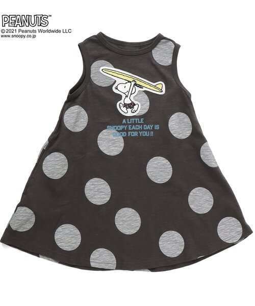 ドット柄のフレアシルエットのワンピースです。 サーフボードを持っているスヌーピーの刺繍ワッペンがインパクト抜群です! リンクTシャツと男女リンクコーデもお楽しみいただけます♪