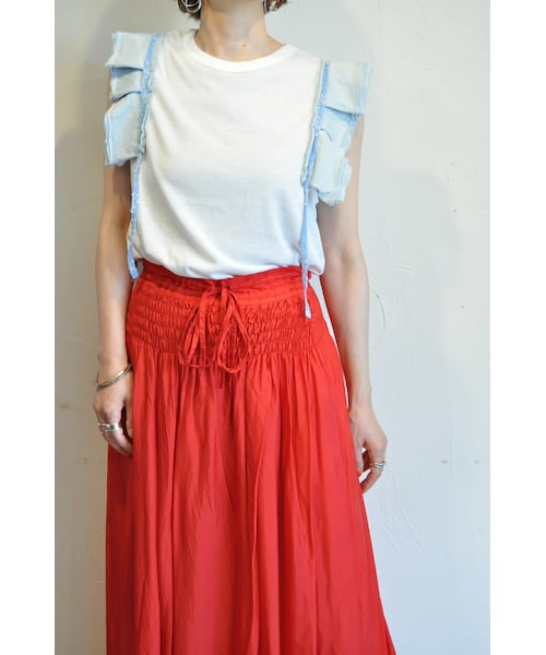 先染めした綿シルクで5層になったタックのフリルはミルフィーユ状の地層のイメージ。 ギャザーが無い大人っぽいフリルで、気になる二の腕もカバーします。 裾やスリットはレースで裏パイピング、柔らかなカットソーが心地よい。 ●商品一覧トップページはこちら↓ http://urx3.nu/LHHy