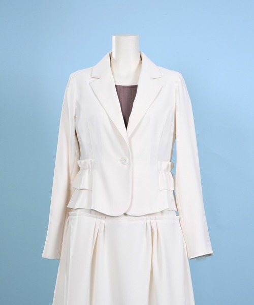 柔らかな素材のジャケットは、かっちりし過ぎず着まわせる、とっても便利なアイテム。 動きやすく、ごわつき感もないので春~夏のオフィスにもぴったり。 ウエストのフリルが他にはないデザインで大人っぽく着こなせます。 お揃いのスカートのセットアップもおすすめですが、 シンプルなパンツ、スカートと合わせるだけで華やかなコーディネートが叶うのもポイント。 オフィスだけでなく、参観日などのイベントシーンにも活躍します。