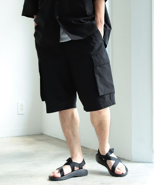 ストレスフリーな履き心地が魅力サラッとした素材感のポリエステルリップストップ素材を使用した、ゆったりとしたシルエットのカーゴショーツです。軽量でストレッチが効いており、太もも周りにも程良いゆとりをもたせた作りでストレスフリーな着用感を実現。両サイドに配されたポケットも日常使いに最適です。ウェストはイージーパンツ仕様になっており、快適な履き心地の一本です。Model:H173cm W58kg Size:M
