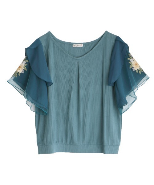 花刺繍の袖デザインがポイントのプルオーバーです。【デザイン】華やかな刺繍はカラーに合わせて配色を変えているので、それぞれ違った印象が楽しめます。ソフトチュールとシフォン生地が重なった袖は、軽くて見た目も涼しげ。ボディ生地には伸縮性のあるリブ素材を使用しており、着心地も抜群です。【コーディネート】シンプルなシルエットなので、スカートからパンツまでボトムを選ばず、幅広いスタイリングに着回しできるアイテムです。【素材】裏地なし 透け感なし 伸縮性あり【スタッフ着用コメント】《スタッフ:SHIORI 身長:158cm 着用サイズ:M 着用カラー:ラベンダー 着用方法:スカートにIN》エレガントコーデに♪お花の刺繍の袖デザインがポイントのリブ素材のプルオーバーです♡お袖はソフトチュールとシフォン生地で涼しげで軽く、伸縮性がある素材ですので着心地がよくスカートにもパンツにも相性がいいと思います◎同じお色の裾のフリルが素敵な紫陽花パネル柄スカート(白)と一緒に同色でコーディネート♪ラベンダーのお色がお好きな方にもオススメです♡《スタッフ:Mai 身長:149cm 着用サイズ:M 着用カラー:ブルーグリーン 着用方法:ハイウエストのスカートにIN》フェミニンカジュアルコーデにも♪お袖に花刺繍が施されたデザインがポイントのプルオーバーにハイウエストのボトムスを合わせました!プルオーバーの華やかな刺繍はカラーに合わせて配色が変わっているので、それぞれ違った印象に♡" 伸縮性のあるリブ素材を使用しているため、着心地も抜群♪《スタッフ:ちようさ 身長:160cm 着用サイズ:M 着用カラー:ラベンダー 着用方法:OUTでスカート合わせ》袖の刺繍がポイントのプルオーバー。ソフトチュールとシフォンが重なっており、見た目も涼やか。柔らかいリブが適度にフィットして着心地バツグンです。