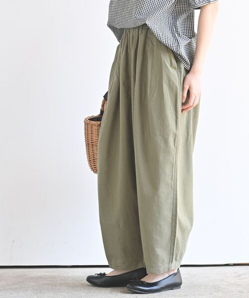 ふわっと可愛い♪丸みのあるワイドパンツ裾にタックを施してほんのり絞ったバルーンシルエットのイージーパンツ。ゆるっとしたフォルムにさりげない丸みをつけた女性らしい1枚です。シーズンムードもあり涼しく着られるコットンリネンブレンドの素材を使用。しっとり柔らかでさらっとした肌触りの夏にぴったりなボトムスです。ルーズなシルエットが脚のラインをカバーして抜け感のあるスタイリングを演出。カジュアルにもきれいめにも使える大人可愛いアイテムです♪裏地なし伸縮性なし薄手ウエスト総ゴムベルトループありヒップ・サイドポケットあり織キズやだま等は生地の特質です色落の可能性もございます(しばらくは単独でお洗濯してください・白系のお洋服や小物類等一緒にご着用されますと色移りする場合がございます)洗濯:手洗い可