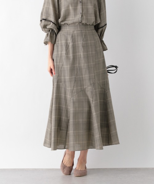 チェック柄でコーデの主役にチェックを生かした切り替えのラインで1枚で主役になるスカート。裾に向かってボリュームを出しているのでウエスト周りはすっきり見せてくれる。チェックが目を引くのでトップスはシンプルなTシャツやニット。秋に向けてジャケットを合わせるのもオススメ♪同柄素材のチュニック(チェック袖ボリュームチュニック/956229)とのセットアップスタイルもおすすめ!