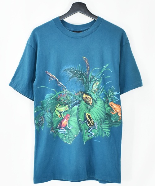 -素材の特徴- ・着心地の良いコットン100%生地。 -デザインの特徴- ・フロントに大きくカエルプリント。 ・グリーンボディ。 ・プリントの中にいろんな種類のカエルがいます。 ・バックプリント。 ・シングルステッチ。 -スタッフコメント- 近年人気が出てきているアニマルプリントのTシャツ。 一枚で様になるデザインのアイテムです。 日本では出回らないデザインが◎ カエル好きには最高な1枚。 -状態- 着用感, ーーーーーーーーーーーーーーーーーーーーーーーーーーーーーー こちらはヴィンテージ商品のため1点ものです。 交換・修理はいたしかねます。 ヴィンテージ商品につき、どちらの商品にもシミ・ダメージ・使用感が多少ございます。 このようなヴィンテージ商品の性質を十分ご理解いただいた上で、ご注文くださいますようお願いいたします。 商品状態につきましては詳細にお伝えするよう努めておりますが、細かな点の表記には限りがございます。 また、画像につきましても、実商品の色味に近しいものを掲載するよう心がけておりますが屋内での撮影のため、多少の誤差が生じる場合がございます。 どうかご理解いただけますようお願いいたします。 ーーーーーーーーーーーーーーーーーーーーーーーーーーーーーー
