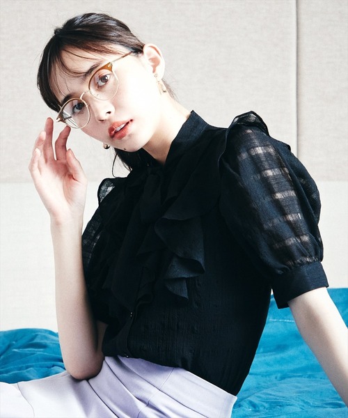 ボリュームのある胸元のフリルとボウタイリボン可愛らしいブラウス 透け感のあるシアー素材の生地は女性らしく、生地に施されたシャドーチェックがシンプル過ぎないデザインです。 【styling】 シンプルなデザインなのでタイトスカートやマーメイドスカートと合わせて通勤にも◎ デニムになどのあえてカジュアルなアイテムと合わせれると、違った雰囲気のスタイリングも楽しめます。 S:(01):着丈54cm 身幅47cm 肩幅31cm 袖丈30cm M:(02):着丈56cm 身幅48.5cm 肩幅32cm 袖丈31cm