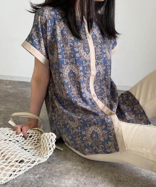 WEB限定 なめらかな生地と落ち感のあるシルエットで大人ラフに着られるシャツ。全体にあしらったシックなカラーのダマスク柄がノスタルジックな雰囲気です。ノーカラーとフレンチスリーブがすっきり見えを叶えてくれるのも◎。前後差をつけた裾はヒップを覆う長め丈でスタイルカバーも狙えます。キレイめパンツを合わせた上品な着こなしもおすすめ。・裾前後差あり【以下オフホワイト参考。カラーにより多少の誤差あり】・透け感:やや透ける・伸縮性:なし・生地の厚さ:薄い・裏地:なし