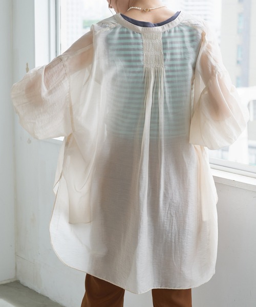 今シーズンもトレンドのシアーバンドカラーシャツ。 すっきりとしたバンドカラーで仕上げた、シアーな質感が魅力的なシャツ。 ドロップショルダーに、ゆとりのある身幅がリラックスムードを演出。 膨らみのあるスリーブも可愛らしく、女性らしい印象を与えてくれます。 サイドにはスリットをあしらい、シルエットに軽やかな動きをプラス。 一枚着はもちろん、軽い羽織としても重宝すること間違いなしの一着です♪ *********************** 洗濯方法:手洗い 裏地:なし 透け感:あり 伸縮性:なし 光沢感:ややあり 生地の厚さ:薄い *********************** ※ご覧のモニター環境や撮影環境により実際の商品と多少色味が異なって見える場合がございます。 【お気に入り登録がオススメ!】 ●商品のお気に入り登録 「在庫残りわずか」の通知や、「完売カラーの再入荷」、「セール」の通知を受けることができます。 ●ブランドのお気に入り登録 新商品や再入荷等、ブランドのお得な情報を受け取る事が出来ます。