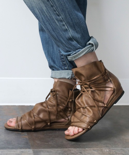 他にはないデザインでモードな雰囲気を醸し出すレースアップサンダル。 サイドのカット面から程よく肌が見えることで、足を綺麗に魅せてくれる。アッパー生地のボリューム感とくしゅっと感が履くだけでセンスの良さを惹き立てます。 程よい高さのヒール&インソールクッションで歩きやすく、かかとのジップで着脱も楽々。 紐で履き心地を調整できます。 お洒落も履きやすさも譲れない≪kOhAKU≫デザイングラディエーターサンダルです。