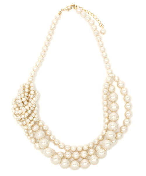 大きさの異なるパールが3連になったゴージャスなネックレス。片側だけサイドを束ねたようなボシューム感が、絶妙バンンスに仕上がっています。 結婚式やパーティなどの華やかなシーンにマッチするお勧めネックレスです。 ※こちらの商品はメッキ加工を施しております。そのため汗・水に大変弱く、水分が付着する可能性がある場合には必ずお外しください。また、使用後はシルバークロスなどは使用せず、柔らかい布でやさしく拭き取り、酸化しないようジップ付きのビニール袋などで保管していただくと、より長く綺麗な状態でお使い頂けます。 店舗へお問い合わせの際は下記品番をお伝えください。 品番:73-22-0354-672