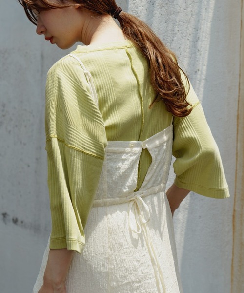 ピグメントの発色がきれいな、ワイドシルエットがポイントのリブカットソー ■デザイン クロップド丈(半端丈)とワイドなシルエットがリラックス感漂うカットソー。 ランダムにピッチの違うリブの生地になっており、表情の豊かさもポイント。 ドロップショルダーで袖が、手首くらいまで落ちてくるので日焼け対策にも役立ちます。 ベーシックで使い易いアイボリーは様々なアイテムと合わせやすく、 綺麗な発色のグリーン、ブルーは夏にぴったりのおすすめカラーです。 ■コーディネート 短い丈なので、細身のスラックスと合わせればタックイン無しでスタイルアップ出来るので、 タックインに抵抗のある方にもおすすめ。 スカートで合わせれば更にリラックス感のあるスタイリングになり 今年らしさを演出出来ます。 シンプルなデザインで大ぶりなネックレスでワンポイントつけて頂くと、 雰囲気が変わって◎ ■素材・洗濯表示素材:再生繊維(テンセル)70%,ナイロン15%, 麻15% 洗濯:手洗い可 タンブル乾燥:不可 アイロン:110℃まで ▼商品のお気に入り登録 ハートマークをクリックし、お好きなカラーを選んでお気に入りに登録 完売カラーの再入荷通知や、ラスト1点の通知、セールの通知も受け取ることができます。 ▼ブランドのお気に入り登録 新商品や再入荷等、いち早くブランドのお得な情報を受け取ることができます。 <返品・キャンセルについて> ・着用・洗濯後の返品・ご交換は致かねます。 ・商品到着後、着用前に商品を確認して頂きますようお願い致します。 ※生産時期により色・素材・サイズ感など多少異なる場合がございます。 ※掲載画像の商品の色味は、屋外や屋内の光の照射や角度により実物と色味が異なる場合がございます。 また表示のサイズ感と実物は若干異なる場合もございますので、予めご了承ください。
