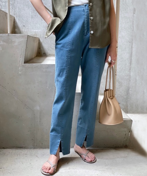 ラビアンジェで人気のセンタースリットパンツがデニム生地になって登場! ◆足のラインをきれいに見せてくれるシルエットと履き心地の良さ◆ 美シルエットを叶えるセンタープレスのストレートパンツ。 裾のスリットがポイントとなるデザインで、足元に抜け感を作ってくれます。 コンパクトなトップスをINした女性らしい着こなし、オーバーサイズやルーズシルエットのトップスと合わせたカジュアルでデイリーな着こなしもきまるアイテムです。 ワンピースとのレイヤードスタイルも好相性。オールシーズン着用でき、着回し抜群の1着。 ・ストレッチが効いたデニム生地 ・フロントウエストはフラットな仕様でトップスインのスタイルもキレイに着こなせる ・バックゴム仕様で綺麗にウエストにフィット ・選べるマルチサイズ展開も嬉しいポイント/大きいサイズ対応[M/L/LL/3L/4L] ・両脇ポケット付き/デニムパンツ *バックポケットはフェイクです。 ◆LAVEANGE◆ ■商品注意事項■ ※屋外での撮影画像は、光の当たり具合で色味が違って見える場合があります。商品の色味は、スタジオ撮影の画像をご参照ください。 ※商品写真はできる限り実物の色に近づけるよう加工しておりますが、お客様のお使いのモニター設定、お部屋の照明等により実際の商品と色味が異なる場合がございます。 ※末永く愛用頂く為に、アテンションタグ・洗濯ネームを必ずご確認の上、着用又はお取り扱い下さい。