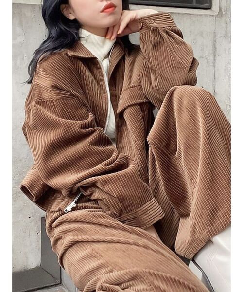 太ウネのコーデュロイのショートブルゾンです。 トレンド感のあるショート丈ブルゾンは、 同素材で展開しているパンツとのセットアップでの着用がおすすめ。 短い着丈のためボリュームのあるボトムとも合わせやすいブルゾンです。 ■セットアップITEM >>コーデュロイワイドパンツ
