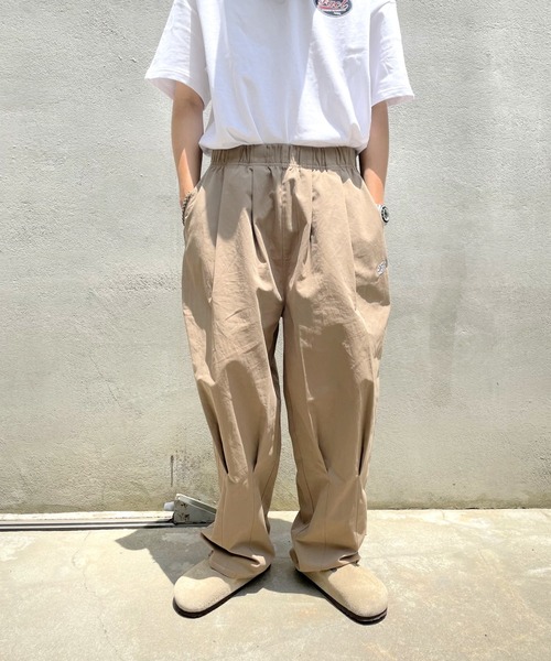 【2021SS / NEW ITEM】近年、ワイドパンツも様々なシルエットが出ている。バルーン型、コクーン型とワイドパンツ1つとっても変化があるアイテム。今回KOOKY'Nから発売するワイドチノも変化を楽しめるシルエットになっている。こだわりは、ニータック。一見聞き馴染みのない言葉ですが、ひざからもも周りにゆとりができ履きやすい。かつ、立体的なシルエットを生みだすデザイン。ただ、タックよってシルエットの見え方が大きく変わる。ただただ太いと不恰好。これは、タックの入り具合がちょうど良い。ボリューム感とテーパードシルエットになっているのでしゅっとした雰囲気に仕上がっている。デザイナーの繊細なこだわりを感じてならないアイテムだと思います。パンツが主役になる1本になりそうです。写真のように、トップスをインしたスタイルも個人的にオススメです。-スタッフ着用レビュー・MENS/H166cmチノパンってカジュアルな印象があるんすけど。ロゴの同色の配色やワイドなシルエット。少し光沢感のある上品な仕上がり。ここまでワイドだと野暮ったくなるかなと思ってたんですが、そんなことないっすね。独特なタックの入り方や、やっぱり僕らのビックシルエットは最高なシルエットっす。もちろんトップスにニットポロやビックのシャツ合わせてもいいですし、ビックteeのタックインしても良さげ。2色買いしようと思ってます。※撮影環境やご覧のモニター環境によって、実物と多少色味が異なって見える場合がございます。ご了承くださいませ。*気になるアイテムは《お気に入り登録》がオススメ!入荷情報やクーポン、セール情報が通知されるようになります。
