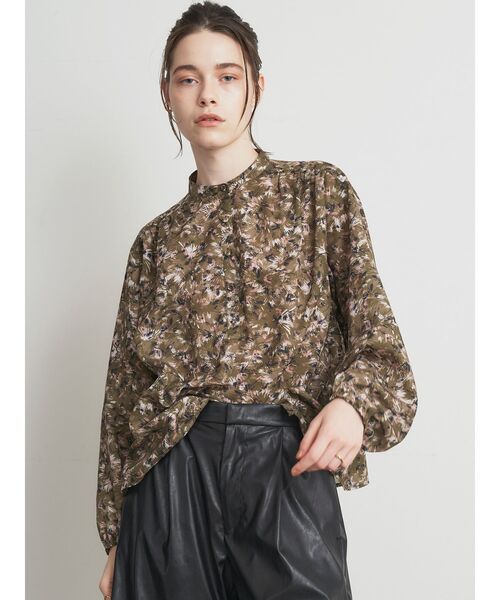【オリジナルプリントが目を引くブラウス】 ふわっとしたボリュームスリーブが女性らしい印象も与え、 スタンドカラーで甘くなりすぎないデザインに仕上げた1枚で華やかなブラウス。 暑い時期でも着心地のよい、やや透け感のあるボイル生地を使ったオリジナルプリント素材。 【色合いもシックで落ち着いた印象に】 袖口がゴム仕様なので捲ることで袖を立体的に見せることも。 アートペイント風の柄は癖も少なくどなたでも着やすいプリントに。 【印象的な柄なので他のアイテムはシンプルに】 合わせるボトムも選ばずスキニー、ワイドパンツなどあらゆる組み合わせが可能。 足元もサンダルやブーツなど季節に合わせてスタイリングが広がります。 ・・・・・・・・・・・・・・・・・・ 透け感:なし 裏地:なし 伸縮性:あり 生地の厚さ:普通 洗濯:手洗い可 ・・・・・・・・・・・・・・・・・・