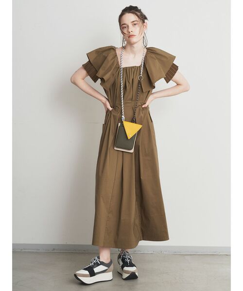 【レディーライクな映えワンピース】 トレンドのフリルディティールにプリーツを加えた袖が他にはない、映えワンピース。 コロナ禍でありながら、特別なオケージョンシーンで女性である事を盛り上げてくれる1枚。 【袖のプリーツがシルエットにアクセントをプラス】 前ウエストはタックでシェイプ間感がありながら、後ろはシャーリングゴムで、かなり見た目とはギャップのあるラクな着心地。 甘いトレンドのディティールも、ハリのあるナイロンテイストの素材を使用する事で、甘さを中和して程良いモード感を漂わせて。 【デザインがあるからこそ1枚でスタイリングが決まる】 足元は抜け感がでるサンダル合わせや、秋口にはブーツ合わせもオススメ。 小物やバッグなど合わせるものによりカジュアルにもきれいめにも使えるアイテム。 ・・・・・・・・・・・・・・・・・・ 透け感:なし 裏地:なし 伸縮性:あり 生地の厚さ:普通 ・・・・・・・・・・・・・・・・・・