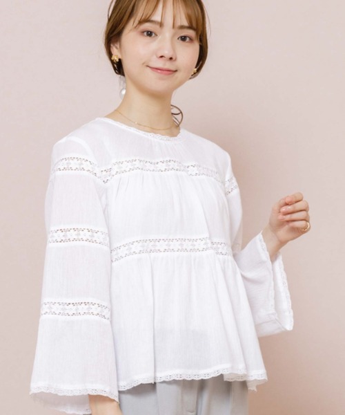 繊細なレース使いとフレア袖が魅力的なブラウス。身頃には大判レース袖口や裾には小さなレースをあしらい細部まで華やかに仕上げました。細かいシワの入った表情のある生地が抜け感を出してくれるので甘くなりすぎず、大人かわいい着こなしにぴったりな1枚です。前後逆にも着ていただける2WAYデザイン。ポイントになるシェルボタンを後ろにした着こなしも◎ ボタンを開けて羽織りとしてもお使いいただける、着回し力抜群の優秀アイテムです。オフィスカジュアルにもおすすめのガーリーなブラウスです♡【お買い物を上手にお楽しみいただくためのPOINT2つ】◎ 購入ボタン横の ♡ (ハートマーク)をクリック! 完売カラーの再入荷通知、残り1点の通知、セールの通知を受け取れます。 (クリックまたはタップで商品のお気に入り登録♪)◎ ショップのトップページにある ♡ (ハートマーク)「お気に入りショップに追加」をクリック! 新商品や再入荷等、いち早くブランドのお得な情報を受け取れます。 (ブランドのお気に入り登録♪)