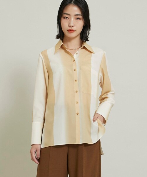 DETAIL大胆なグラデーションがアーティなグラフィックシャツ―Detail―浮世絵にみられる独特なかすれ感をグラデーションで表現したオリジナルグラフィック柄のシャツです。知的でエレガントな印象で装うことができ、シワにもなりにくいのでデイリーに着ていただけます。タックパンツやフレアスカート、タイトスカートは勿論、トレンドのフェイクレザーのボトムスともマッチします。―Fabric―美しい落ち感と軽やかさがあるポリエステル素材です