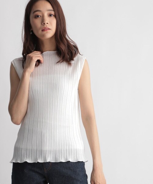 プリーツとメロー仕上げがポイントのデザイントップス。伸縮性がありながら身体に張り付くことなく、軽く清涼感のある着心地です。真夏のワンツーコーデからレイヤードスタイルのインナーまで、何かと便利な一枚。先シーズンへの変わり目にも合わせやすいハイネックが女性らしさを両立。【素材】プリーツ加工カットソーさらっとした肌触りとシアー感が特徴伸縮性もかなり高く、横によく伸びる素材です袖部分:シフォン透け感のある柔らかい生地ストレッチあり透け感なし裏地なしファスナーなし【お手入れ】ストレッチあり透け感あり裏地なし