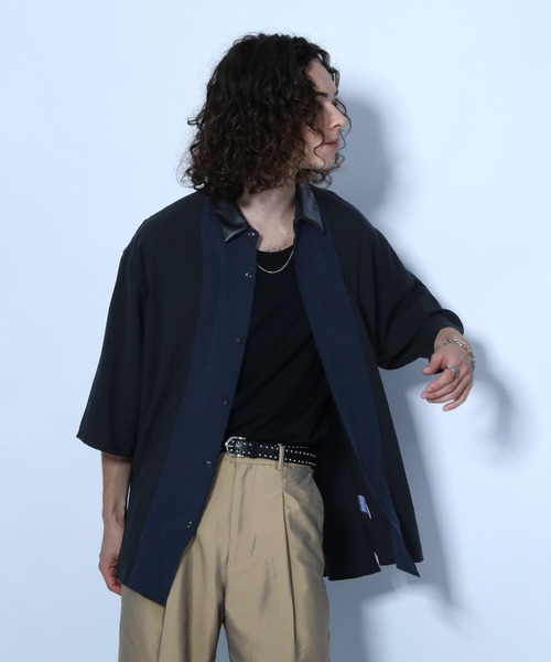 PUレザーで切り替えたデザインシャツ。 今年注目の切り替えデザインを異素材で表現した一着。 ツルッとした生地感と、微配色の切り替えにすることで上品な印象に仕上げました。 フレアシルエットのパンツと合わせていただくとトレンド感のあるスタイリングに。