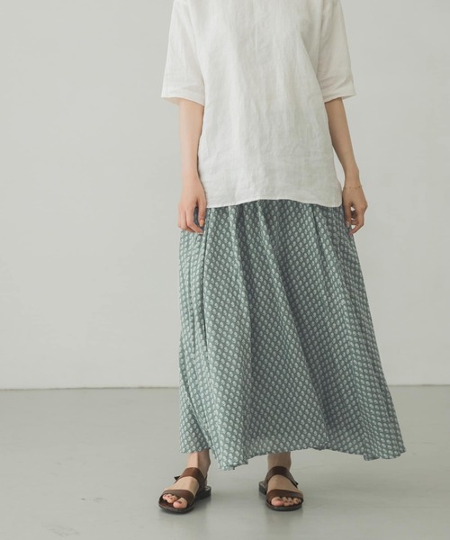 シーズンムード高まる小紋柄のプリントスカート。 インド製のナチュラルな生地がコーディネートに程よい柔らかさをプラスします。 さらっとした肌当たりで見た目にも涼しげなアイテム。 シンプルなトップスを合わせるだけで様になり一枚あると重宝します。 ウエストがゴムと紐仕様になっているためストレスフリーな穿き心地もうれしいポイントです。 ※この商品はインド製の生地を使用し、インド国内で縫製・加工して生産しています。インド製ならではの風合いとデザイン性を重視したデリケートな商品ですので、下記の点にご留意ください。 ※色合い・風合い・サイズが一点一点微妙に異なり、また多少のゆがみ・シワ等も生じています。 ※着用時の摩擦や汗、雨等により色移りする場合がありますので、充分ご注意下さい。着用の際は淡色物との重ね着やバック・靴・アクセサリーとのコーディネートはお避け下さい。 ※商品画像は、光の当たり具合やパソコンなどの閲覧環境により、実際の色味と異なって見える場合がございます。予めご了承ください。 ※商品の色味の目安は、商品単体の画像をご参照ください。 ----------------------------- 透け感:なし 伸縮性:なし 裏地:あり 光沢:なし ポケット:なし -----------------------------