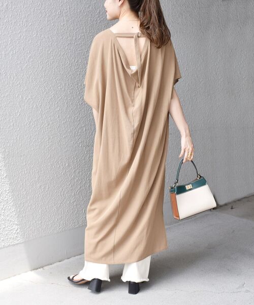 バック部分のストラップがポイントのワンピース。メッシュのような透け感がある素材で、プリントパンツとのレイヤードスタイルにおすすめの一枚です。ドライタッチで表面感がある強撚ガス焼きラッセルを使用しています。同素材でトップスのご用意もございます。品番:312-32-0778-------------------------------------生地の厚み:薄手伸縮性:有透け感:やや有光沢感:無水洗い:可-------------------------------------【スタッフ着用コメント】身長:156cm/体型:細身/普段サイズ:36/着用サイズ:ONE SIZEサイズ感:体のラインを拾いにくい、全体的にゆったりとしたシルエットです。コメント:サイドスリットが入っていて、少し透け感があるので、パンツやスカートとのレイヤードが映えるワンピースです。バックシルエットが綺麗で、背中の開きが気になる方はネック部分のベルトを絞って着用するのをおすすめします。-------------------------------------※末永く愛用頂く為に、アテンションタグを必ずご確認の上、着用又はお取り扱い下さい。※屋外での撮影画像は、光の当たり具合で色味が異なって見える場合があります。商品の色味は、スタジオでの詳細画像をご参照ください。※画像の商品はサンプルです。実際の商品と仕様、加工、サイズが若干異なる場合がございます。