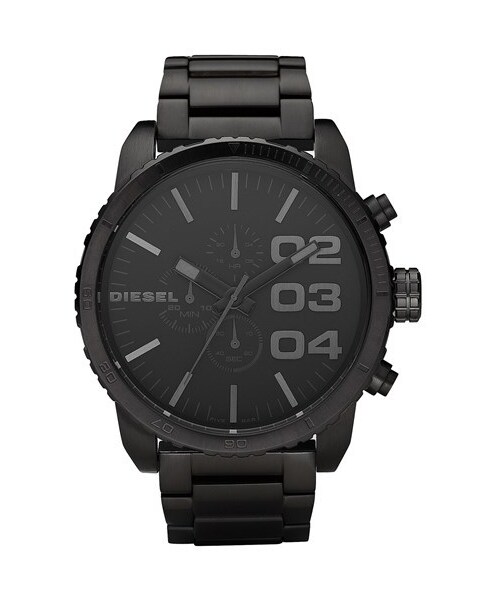 Slender tachymeter bezel encircles an oversized watch with stylized numerals marking the three-hand chronograph dial. A handsome stainless steel bracelet completes the bold style. 51mm case; 26mm band width; 200mm band length. Trifold buckle closure. Water-resistant to 5 ATM (50 meters). Stainless steel/mineral crystal. By DIESEL®; imported.