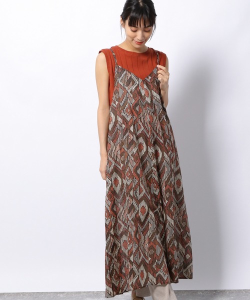 コットンボイルの軽い素材を使用した、キャミワンピース。 生地をあえて斜めにとることで、動きのある美しいシルエットに仕上げています。 ストラップは、華奢な細さでシャープな印象に。 【素材】 コットン100%の繊細な糸を使用し、ふんわりとした軽い質感に。 エスニックテイストの柄をプリントした、シーズンムード溢れる素材です。 【スタイリング】 ボトムスを合わせた、レイヤードスタイルがオススメです。