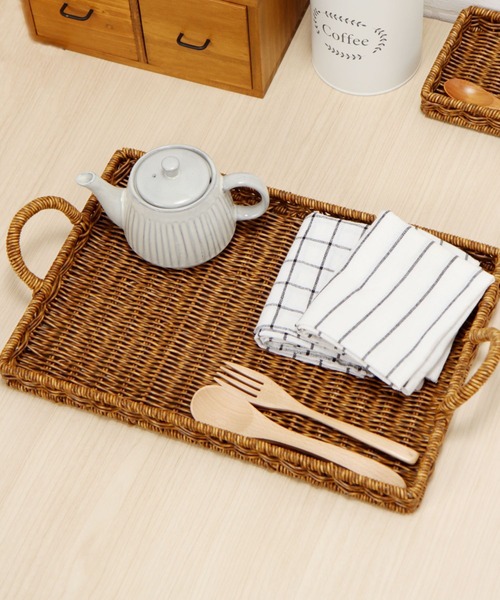 天然素材見えするナチュラルな風合いの取っ手付きトレイ。 樹脂製なのでささくれの心配もなく、水に強いためキッチン周りでのご使用にも最適。 お揃いのPPシリーズでのコーディネートもおすすめです。