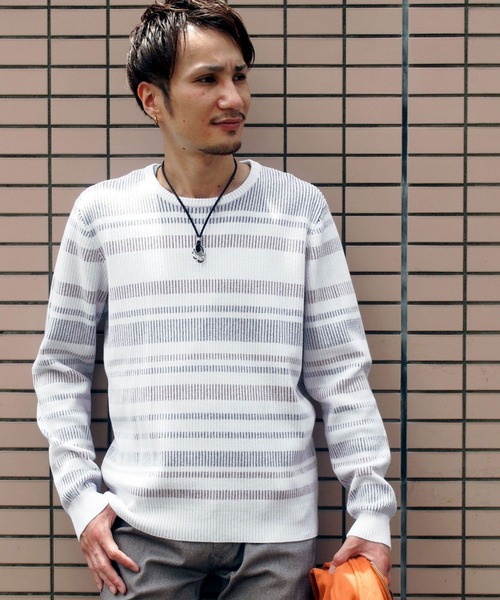 綺麗な目面としっかりと詰まった度目感のあるハイゲージニットです。表側が針抜きリブになっており、裏側のボーダーが透けて見えるようなデザインになっています。針抜きリブの縦柄見え効果で、ボーダー柄でもシャープな印象になります。綿混素材でチクチク感のない快適な着心地も魅力です。 ※画像の商品はサンプルです。実際の商品とは仕様・加工・サイズ・素材が若干異なる場合がございます。 ※屋外での撮影画像は、光の当たり具合で色味が違って見える場合があります。商品の色味は、スタジオ撮影の画像をご参照ください。