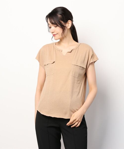 綿麻素材でさらっと着られるミリタリーデザインのTシャツ スリットネックでナチュラルな印象です。 胸元のポケットがミリタリー風なデザインポイントです。 後ろの着丈が長めになっているので、パンツスタイルでスッキリ着られます。