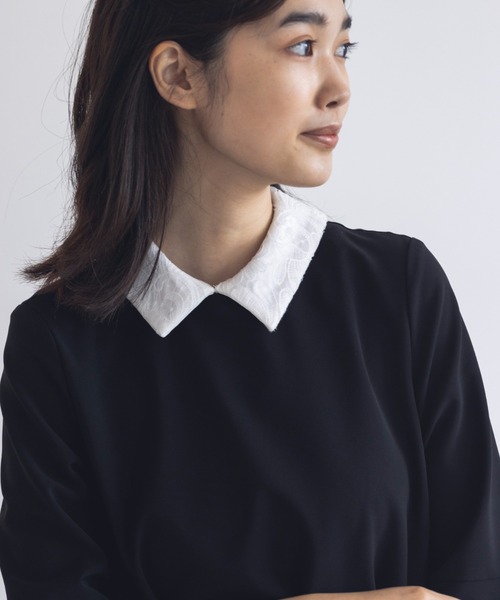 シンプルなワンピースとのセット使いがおすすめのレースの付け衿。 シャープな衿先と大きすぎない形が、トレンドを上手に抑えた大人の付け衿です。 繊細な編みのインポートレースを全面に使用しているのがポイント。 スナップでの着脱の為、付けやすく、取れにくいストレスフリーの仕様です。 お手持ちの丸衿ワンピースともコーディネイト可能です。