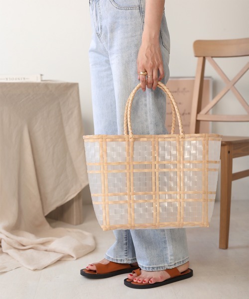 ●Bab● ■POINT 透け感がシーズンムードを高めてくれるクリア編みバック!ウッド調とクリア素材によって作られたチェック柄のような編みデザインがポイントです。また、パソコンもすっぽり入るほどの大きさなので収納力が高いのも魅力。クリア素材で程よく中が透けるので、お気に入りの小物を入れてお出かけを楽しんで頂ける一品です。 ■FABRIC ポリプロピレン素材を使用しているので、水に浮かぶほど軽く、またバックの開け口が広いのでもたつかずに中身を取り出すことが出来ます。 ■COORDINATE クリアな透け感が魅力でこれからの季節にピッタリなので、さらにシーズンムードを高めるワンピースやシアートップスと合わせると◎収納力抜群の大きさなので、レジャーやグランピングなど少し多い荷物が必要な時にも活躍します。 ※撮影環境により、多少実際のカラーと異なる場合がございます。また、携帯やスマートフォン、パソコンなどの画面上と実物では多少色が異なって見える場合がございます。ご了承下さいませ。 ※画像の商品はサンプルのため、実際の商品と若干仕様が異なる場合がございます。 ※濃色品は、過度な摩擦や濡れた状態での摩擦により、色落ち・色移りをする恐れがあります。 ※この商品は、素材の特性上、洗濯の際に多少の縮みが生じる恐れがあります。洗濯後は形を整えてから干してください。 ※その他お取り扱いに関しましては、商品に付属のアテンションタグをご覧ください。 ★商品のお気に入り登録 再入荷やラスト1点のお知らせ、セール情報などお知らせを受け取ることができます! ★ブランドのお気に入り登録 新商品や再入荷などのお得な情報を受け取ることができますので、是非ご登録ください。