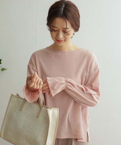 表面感のあるクレープ生地で甘さのあるブラウスをご用意しました。キャンディースリーブがより可愛らしさを演出し、春のコーディネートを華やかにしてくれます。シボの繊細な風合いは雰囲気作りだけでなく、ストレッチが効いたような着心地や清涼感もあるため、気温が上がってからでも長く着用することができます。袖や生地以外はシンプルに仕上げ、着丈も長すぎないので合わせるボトムスも選びません。※商品画像は、光の当たり具合やパソコンなどの閲覧環境により、実際の色味と異なって見える場合がございます。予めご了承ください。※商品の色味の目安は、商品単体の画像をご参照ください。透け感:あり伸縮性:あり裏地:なし光沢:なしポケット:なし