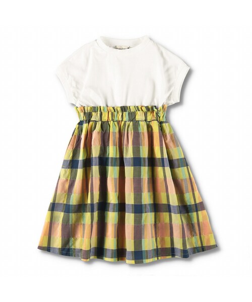 カラフルな色合いが特徴のマドラスチェックがパッと目を引くドッキングワンピースです。 少しつまったネックデザインやフレンチスリーブ袖も可愛いポイント! デイリー使いはもちろん、ちょっとしたお出かけ着としてもオススメです。 ----- 裏地:なし ポケット:あり(右のみ) ウエストゴム調整:不可