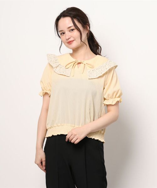 可憐な花模様の刺繍オーガンジーで衿を縁取った、イノセントな愛らしさ漂うブラウス。 袖口のフリルや裾のシャーリングも甘さとメリハリ感をプラスするアクセントに。 コーディネートに取り入れるだけでも、大人ガーリーな着こなしが楽しめるアイテムです。