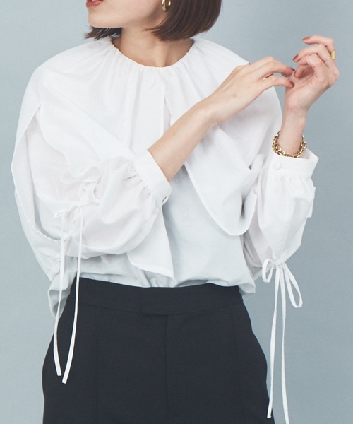 *POINT*これ1着でぐっとトレンド感が増す、大襟デザインブラウス。 シルクのような滑らかな軽い素材感で、早い時期から着られる! *DESIGN* 秋も継続トレンドの大襟デザイン! 肘までつながる大襟がポイントで一枚で華やぐアイテムです。 品のでるクルーネックにギャザーを施し、ふわっと立体的なフレア襟を作りました。 サイドはスリット開きにし、紐で結んだり開いたりアレンジが楽しめます。 *COORDINATE* 継続トレンドの大襟デザインブラウスは、秋のクローゼットに新調しておきたい! クラシカルな雰囲気なので甘くなく、大人の方にもおすすめできるブラウスです。 テーパードパンツやセンタープレスパンツで合わせると、シックな雰囲気になりオフィスカジュアルなら問題なくOK。 カジュアルに着たい方には、デニムやニットパンツとの合わせが◎ イン・アウトでも印象が変わるので、色んな着方を楽しんでいただけます。 シルクのような滑らかな軽い素材感。 皺になりにくく、手洗いが可能です。