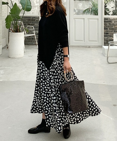 ロング丈 の 花柄 スカート と ニット がドッキングされた ワンピース が登場しました 。 - デザイン - トレンドのドッキングワンピース。 花柄 フレアスカート のコンビネーション。 一点で着るだけでも旬なスタイルに変身できる便利なアイテムです。 トレンドコーデにおすすめの ロングワンピース 。 足首が程よく見えるロング丈でボトムのチラ見せもきまります。 ※サイズは測定の方法と測定する方により誤差が出る可能性がございます。 着用時の体型によって、サイズ感には個人差があります。 ※商品到着時にアイテムによっては畳ジワや折りジワなどが出ている場合がございます。 ※生地の特性からにおいが気になる場合は陰干しをおすすめしております。