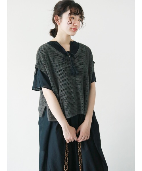 メッシュ編みで軽やかな風合いに仕上げたニットベスト。 前後どちらをフロントにしても着られる2WAYデザインで、コーディネートの幅もグッと広がります。 トップスに重ねて着るのはもちろん、カットワンピースなどと合わせたコーディネートもおすすめです。