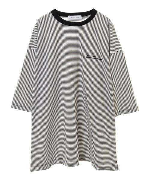 <素材について> 着心地の良さが魅力の、高密度コットンとミジンコボーダーを使用しています。 <デザイン・仕様について> ワンポイントに胸元にブランドロゴとメッセージ刺繍を施しています。 男女問わずユニセックスで着ていただけるTシャツです。 友達同士やカップルでのお揃いコーデにもオススメです!! <サイズ感・シルエットについて> リラックス感のあるハーフスリーブのドロップショルダーです。 <サイズ表記> 2=S、3=M、4=L