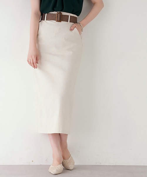 【2021AW natural couture】履き心地豊かなストレッチリネン素材が魅力◎※331400430と同型です。■Design身体のラインを拾いすぎず、程よくフィット感のあるすっきりとしたタイトシルエットが魅力。脚のラインを華奢に見せてくれるミディ丈に仕上げました。伸縮性のある素材の、付属のベルトは、やや太めの仕様でお作りしており、ウエストマークするとコーデにメリハリが生まれます。ベルトを外して、ハイウエストな雰囲気でもスタイリングを楽しんで頂ける1着。■Styling異素材のブラウスやシンプルなTシャツをウエストインして頂くのはもちろん、ゆったりめのシャツやブラウスをウエストアウトして、ゆるっとコーデで合わせても◎シンプルなデザインで季節を限定せず着用頂け、合わせるトップスの幅が広がる1品です。■Fabric 程よくストレッチの効いたストレスフリーな履き心地が特徴。自然な風合いの生地感を楽しんで頂ける1着です。カラーはコーデに馴染みやすいライトベージュ・ベージュ・グリーン・ブラックの3色展開でご用意しました。================透け感:ほとんどなし裏地:あり伸縮性:あり光沢感:なし生地感 :身体馴染みの良い生地感================【お気に入り登録でお得な情報がいっぱい】・「商品のお気に入り登録」で再入荷通知や、ラスト1点の通知、セール通知をいち早く受け取ることができます。・「ブランドのお気に入り登録」で新商品や再入荷など、お得な情報を受け取ることができます!
