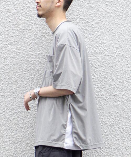 ~2021 SPRING/SUMMER COLLECTION~ナイロン素材のキレイ見えする半袖ポケT■デザインゆったりしたサイズ感の半袖ポケTです。右裾部分に同色のファスナーを取り付けており、好みの深さのスリットを作ることが可能です。襟のリブを細くすることでカジュアルになりすぎず、キレイ目な印象で着ていただけます。■素材程よい厚みのストレッチナイロン素材を使用しています。ストレッチが効いているため、カットソーTシャツのような快適な着心地になります。■スタイリングシンプルデザインのため幅広いアイテムと相性◎カットソーのインナーなどをレイヤードすることで新しい表情が楽しめます。透け感:なし生地の厚さ:やや薄い光沢感:ややあり裏地:なし伸縮性:あり家庭洗濯:可能(ネット使用)【スタッフ着用コメント】身長:173cm 普段着用サイズ:普段着用サイズ 試着サイズ:Lサイズ感:ゆったり目なサイズ感です いつもと同じサイズでリラックスしてお召し頂けます。素材感:ストレッチの効いたナイロン素材で、サラッとした肌触りです。コーディネート:キレイ目な印象にも仕上がるので、幅広いコーデに取り入れていただけます。【注意点】※撮影商品はサンプルの為、実際の仕様と異なる場合がございます。※画像の商品は光の照射や角度、お使いのモニター環境により、実物と色味が異なる場合がございます。スタジオ物撮りの画像が実物の色味に一番近くなっております。※予約商品の場合、実店舗への入荷は「お届け予定」とほぼ同時期となりますが、実店舗への入荷が前後する場合もございます。品名:NM ストレッチナイロン C/N 品番:7515-610-0064