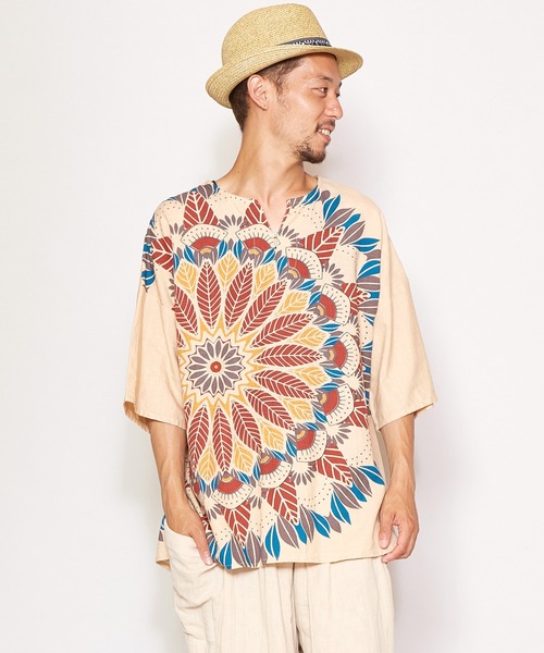 - Resort - Mandala Kurta美しく幻想的に広がる曼陀羅(マンダラ)のように、ゆったりと時間を楽しむ。そんなマンダラを鮮やかにデザインしたメンズクルタ。グラデーションカラーが美しく、夏を涼やかに過ごせる1枚です。風通しの良い綿素材で、歩くたびに風に踊るよう。ボヘミアンな気分で着こなして。曼陀羅(マンダラ)とは古代インドで発祥したマンダラは“本質・中心を持つもの”という意味。アジア諸国へ伝わり、描く瞑想として人々を本質へと導いてきました。マンダラの中心は創造の源泉や永遠を表し、そこから広がる生命のように見てとれます。その美しさから現代ではアートとして親しまれ、描くことで己を知り癒されることから、世界中で愛されています。※こちらの商品は1点1点職人による手作りとなります。その為、生地の取り方により柄の配置や形・色合いなど若干異なる場合がございます。あらかじめご了承ください。※屋外での撮影画像は、光の当たり具合で色味・カラーが違って見える場合がございます。商品のカラーは、スタジオ撮影の画像をご参照ください。Amina Collection Co.,LTD.