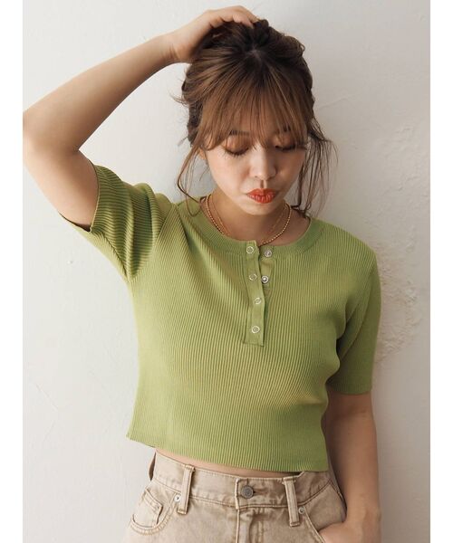 清涼感のある強撚糸を使用したサマーニットです。襟ぐりにはリングドットボタンを配置しているのがデザインポイントとなっています。ショート丈のトップスのためヘルシーな肌見せがスタイリングのポイントとなる一枚です。