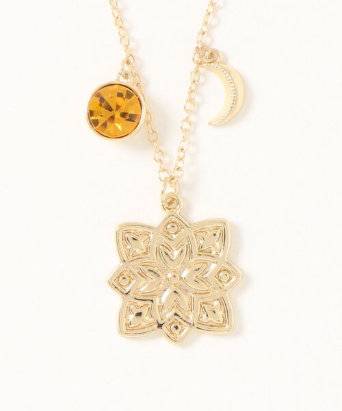 Moroccan Mandala Necklace自然のライフサイクルを表すマンダラ。古代エジプト人にとっては、生命を与える太陽と宇宙であるラー神の象徴とされていました。そんなマンダラとラインストーンを組み合わせたエキゾチックなネックレス。なにげない日常に彩りを与えてくれます。●ホワイト→White Moon【白い月】透き通る夜空に輝く純白の月。概念を取り払いピュアな心を。●グリーン→Green Energy【緑のエネルギー】オアシスの木々のような力強い生命力を。●ブルー→Blue Time【青い時間】水面にこぼれる雫のように環境と調和しながら美しい時間を。●イエロー→Gold Sunshine【黄金の太陽の光】まばゆい光に包まれて輝く。●レッド→Red Cosmo【赤い宇宙】非日常的な一日を。●オレンジ→Orange Wind【オレンジの風】強風に作られた輝く砂。逆境を味方に。曼陀羅(マンダラ)とは古代インドで発祥したマンダラは“本質・中心を持つもの”という意味。アジア諸国へ伝わり、描く瞑想として人々を本質へと導いてきました。マンダラの中心は創造の源泉や永遠を表し、そこから広がる生命のように見てとれます。その美しさから現代ではアートとして親しまれ、描くことで己を知り癒されることから、世界中で愛されています。※こちらの商品は1点1点職人による手作りとなります。その為、形や色合いなど若干異なる場合がございます。あらかじめご了承ください。Amina Collection Co.,LTD.