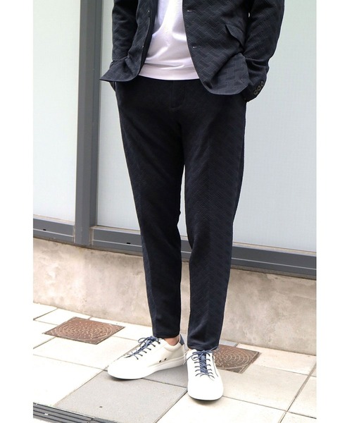 凹凸のあるジャカード生地を使用したイージーパンツ。ウエストにゴムを入れ、ドローコードを通しているのでベルトレスでも着用できます。ベルトループ付きでドローコードを裏側に通しているのでベルトを付けたスタイリングも楽しんで頂けます。腰回りにゆとりを出しながらテーパードした綺麗なシルエット、伸びを活かした縫製仕様にする事で穿き心地を良くしています。表地は凹凸のある変形組織のジャカード生地を使用。膨らみのあるはっきりとした柄感、カットソーならではの高い伸縮性がありながら仕立て映えするしっかりとした張り感があるのが特長。同素材でジャケットも展開しているのでセットアップでのスタイリングが可能です。