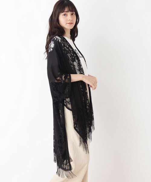 【デザイン】ポンチョ風のレースカーディガン。動きのあるヘムラインのフリンジが視線を集めます。着流しデザイン&ロング丈でスタイルアップ効果も期待できます。【生地感】シャリ感のあるレース素材でさらっと着用して頂けます。軽くてしわにもなりにくいので持ち運びにも便利な1枚です。#CutieBlonde#Cutie#cutieblonde#cutie#キューティブロンド#キューティ#20代#30代こちらの商品は主に秋に着用いただける商品です。モデル情報:身長168cm B75 W60 H87 着用サイズ:00店舗へのお問い合わせ商品番号:256-33301●製品寸法:00(FREE):着丈88cm B224cm 裄丈56cm備考: