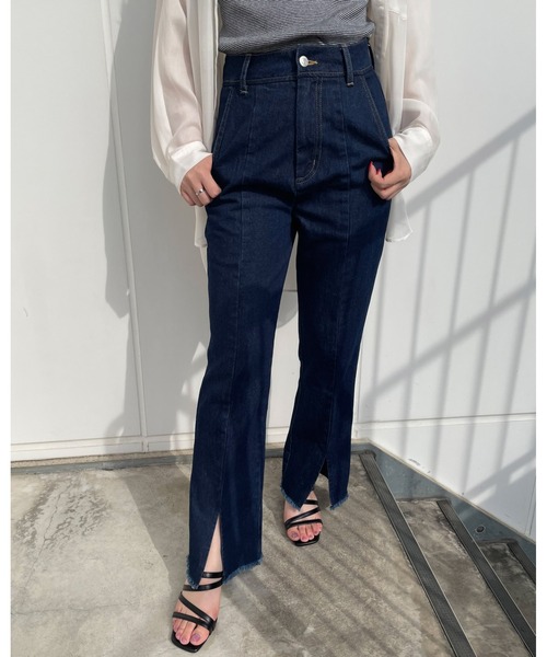 WEB限定 カジュアルスタイルの定番デニムはフロントスリットで抜け感をプラス。 シンプルで合わせやすいデニムパンツが登場です。 センターシームとスリットを組み合わせた新鮮デザインがポイント。 裾部分にはフリンジをあしらってアクセントにしています。 すっきりとしたシルエットでスタイルアップを狙えるのも◎。 程よい厚みの生地はシーズンレスで着回せます。 ・ポケットあり ・フロントスリットあり 【以下クロ参考。カラーにより多少の誤差あり】 ・透け感:透けない ・伸縮性:なし ・生地の厚さ:薄い ・裏地:なし