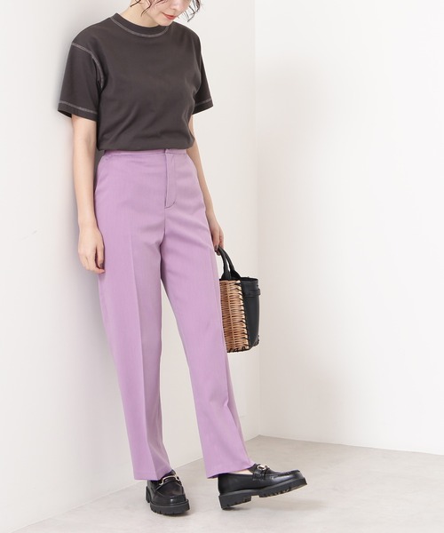 ハンサムな表情のセンタープレス入りパンツ。トップスをインしたときにフロント釦がアクセントになり、ウエストの後ろはゴム仕様でフィット感があります。程よくワイドでストレートなシルエットに、センタープレスを施したデザインで、レッグラインを上品に見せてくれます。シャツやブラウス、今季注目の袖コンシャスなトップスなど、ONにもOFFにも活躍できます。